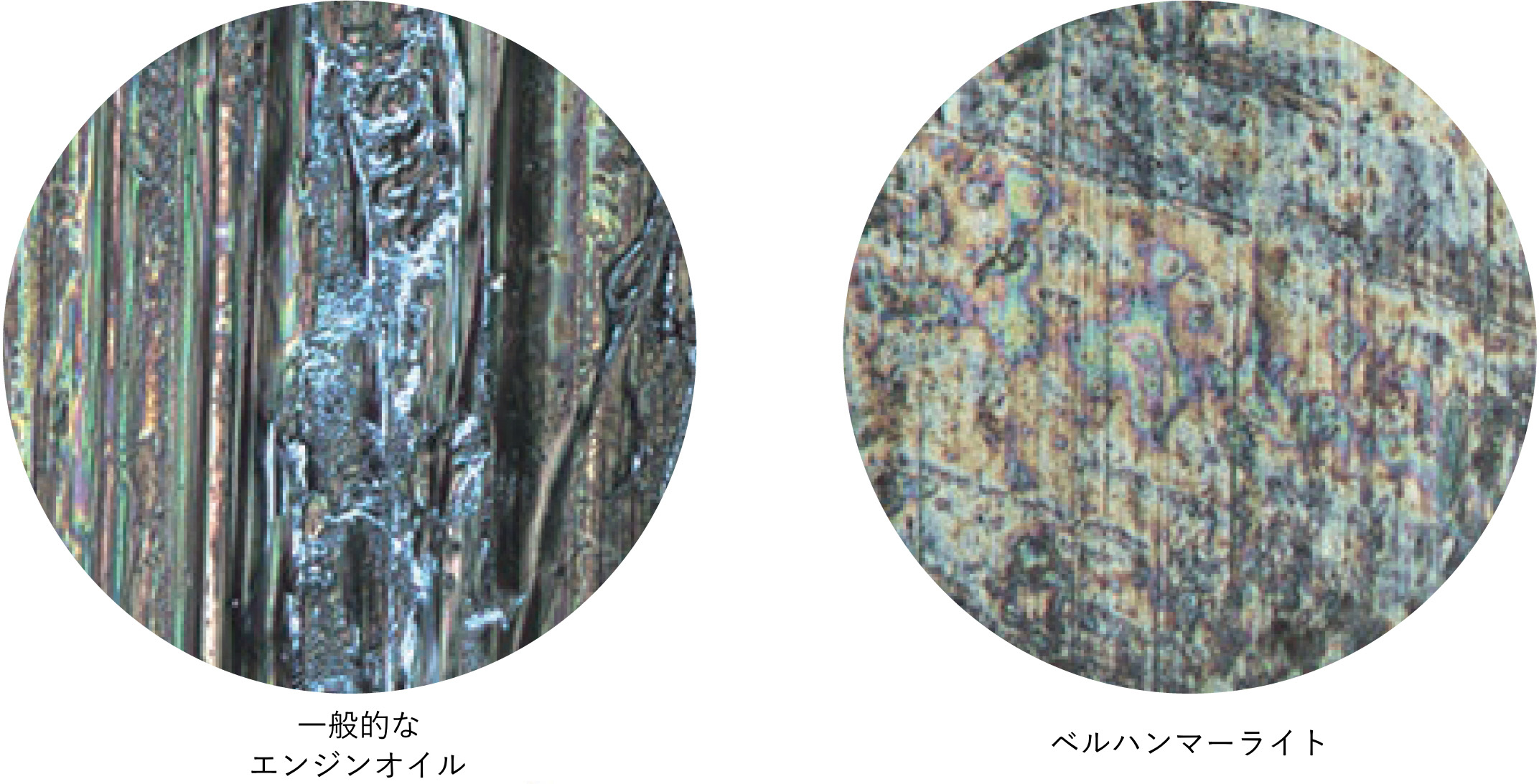 一方、ベルハンマーライトを10%添加したエンジンオイル(画像右)はキメが細かく、摩耗痕も少ないという結果が得られました